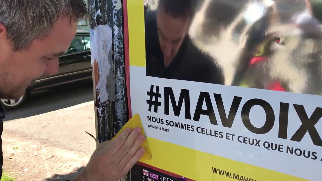 Bon à savoir : ce tutoriel a été réalisé avant la campagne officielle sur un panneau public et sur une affiche d’un autre candidat. Ceci n’a été fait que pour ce tutoriel.La pose des affiches #MAVOIX ne se fera que sur l’emplacement prévu à cet effet sur les panneaux officiels de la campagne législative de juin 2017.